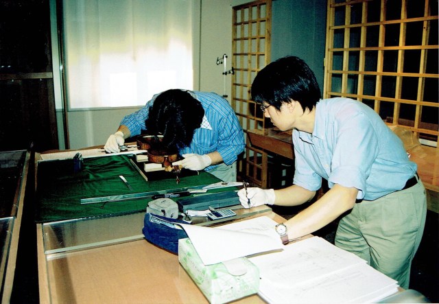 (博物館における採寸調査風景、当時の同僚N.Vendrame (奥)と筆者(右)、2003年ごろ)