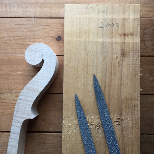 今回はブロック材に16年経ったイタリアの柳材を使います。たまたま16年経ったというだけで、それ自体にはあまり意味はありません。古材を使ったから良い楽器ができるとは必ずしも言えないように思います。良い材をたまたまストックしていたら16年経ったというだけのことと考えています。