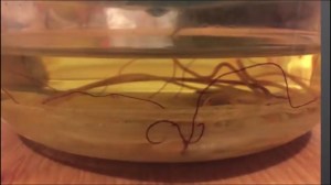 ②ガット弦に糸をつけたままガラスの容器に入れ、油を注ぎます。