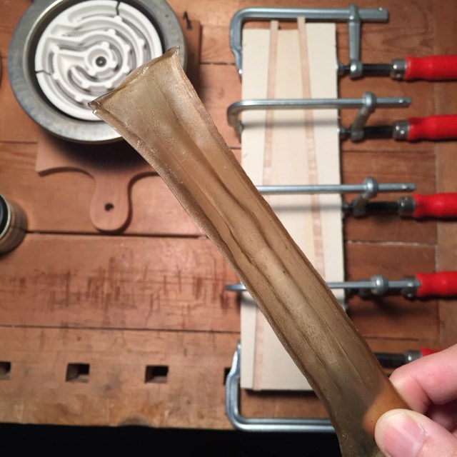 もう一つ、膠の強さの目安として、塗布から乾燥にかけて膠同士がお互いを引き合う強さというものがあります。この強さは相当なもので、やはり科学的な根拠はないのですが、これまでいろいろな膠を使ってきた中で、この鹿膠はかなり強いという感触を得ています。メープル(楓)材の接着時の水分による膨らみもしっかり引き寄せてくれます。
