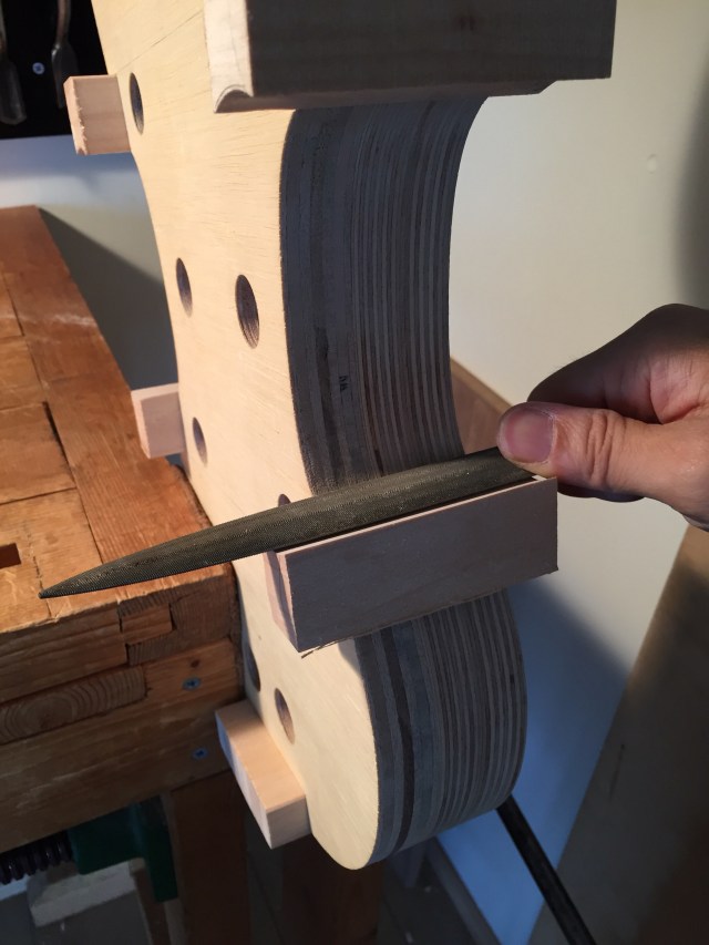 ヴィオロンチェロ・ダ・スパッラのブロックはコテ鑿(のみ)と呼ばれる外丸鑿の一種で削り落とし、ヤスリで仕上げていきます。何度も見直しが必要な作業で、目立たなくとも「美」がその姿を独り現すまで続けなければならない作業の一つです。