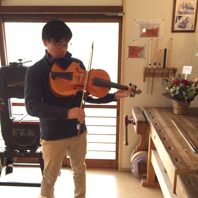 できたばかりのテールピース に天野寿彦先生に助けていただき何とか弦を張り、早速試奏していただきました。