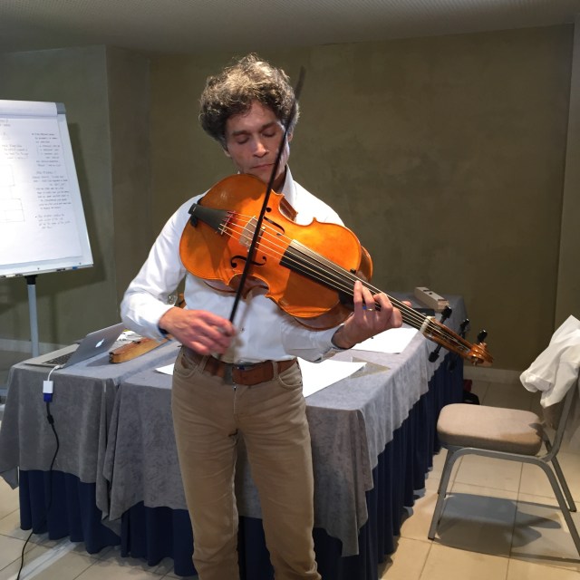 今回、スペインにやってきた大きな目的の一つは世界的に知られたヴィオロンチェロ・ダ・スパッラの第一人者でもあり、10年来の友人でもあるバディアロフさんに私の楽器を試奏してもらい、また彼の楽器も試奏・採寸させてもらい、違いや今後の方向性見極めることでした。