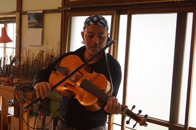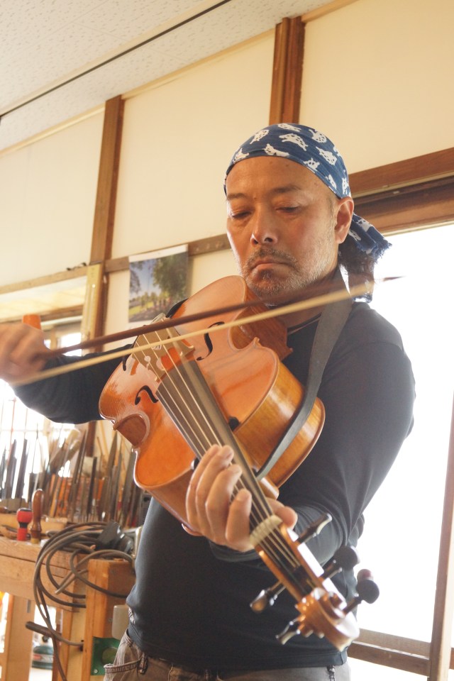 今日はヴァイオリニスト・古澤巌さんが肩掛けチェロ、ヴィオロンチェロ・ダ・スパッラの試奏に当工房に来てくださいました。
