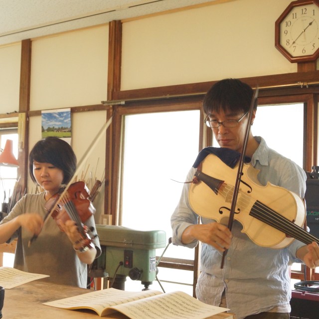 弓の試奏も兼ね、スパッラの試奏や一緒にいらした天野寿彦先生と合奏を聴かせてくださったのはとてもうれしい時間でした。