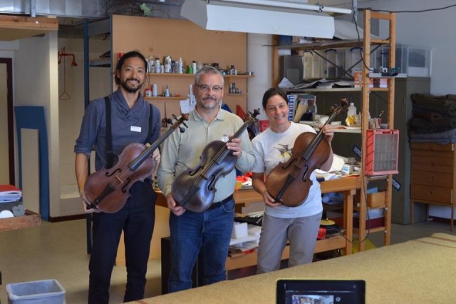 同僚のガット弦エキスパートのダニエラさん、その夫でプロのフルーティストでありながら今年ダニエラと一緒に肩掛けチェロを作ったアレッサンドロさん、プロのジャズギタリスト・ギター製作家でやはり肩掛けチェロ製作を手掛けているトマさんの3人がブリュッセルの楽器博物館で、Hoffmanのヴィオラ・ポンポーザ(との呼称で展示されている楽器)などの採寸調査を実施しました。