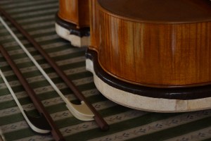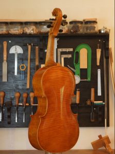 納品1~3か月後の少し弾きなれたころに、駒の調整などと合わせて、無償点検をさせていただきます。また今回は、肩掛けチェロに必要不可欠なストラップはもちろんのこと、弓と専用特注ケースもご要望によりつけさせていただきました。弦はもっぱらバロックを楽しまれているということで、アクイラ社のガット弦を張らせていただきました。