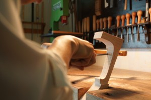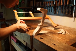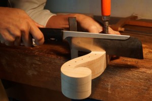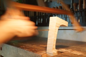 今日の弦楽器製作ではネックを切り出さずにペグボックスとスクロールを先に仕上げる方法が主流なのですが、私はスクローラヴェッツァ先生にネックを先に切り出すことを学び、それをずっと採用してきました。今日主流となっているペグボックスとスクロールを仕上げる方法の方が作業のしやすさという意味では合理的だと思うのですが、なんとなく合理的な工程として2度、弓鋸を持たなけれならず、昔の人が大事にした早さを犠牲にする気がしてピンとこないというのが率直な感覚としてあるからです。