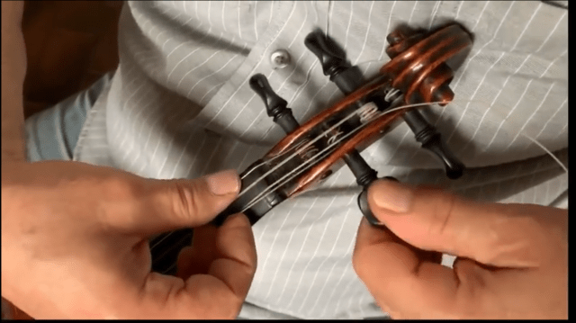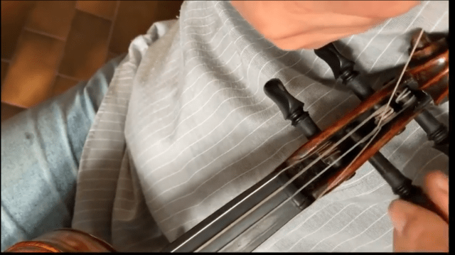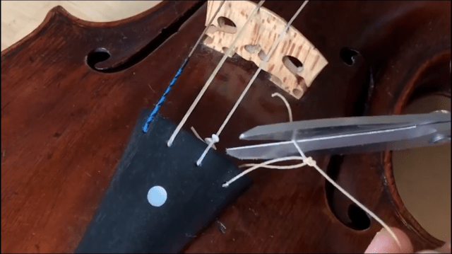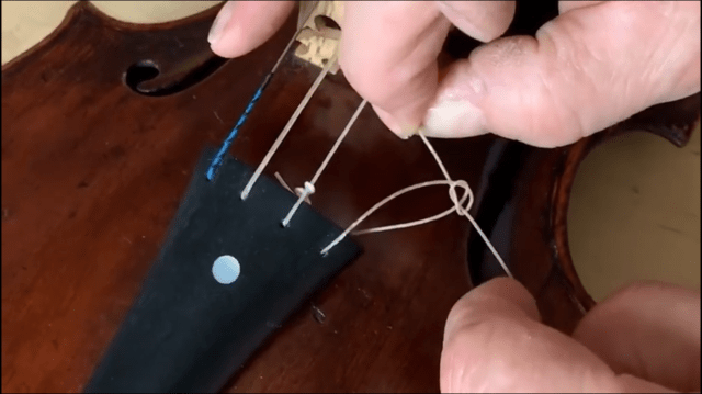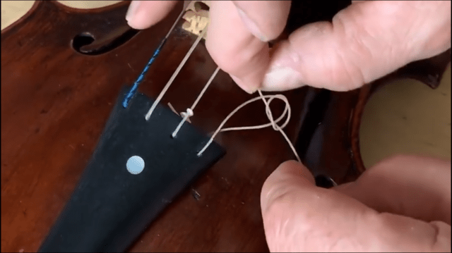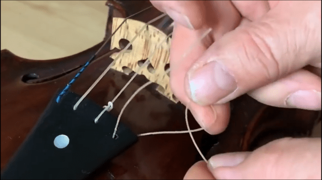(※ガットの結び目をテールピース下に来るようにする結び方は以前にDaniela Gaidano氏の説明をブログ内で紹介してあったはずなので、ご興味ある方はそちらをご参照ください)