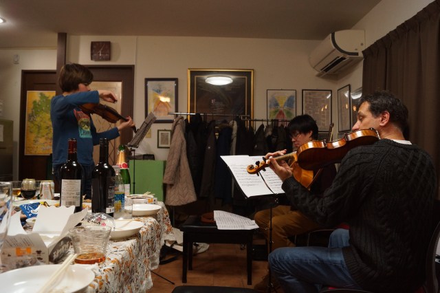 昨日は、天野寿彦先生の門下の方々とのワークショップ&忘年会で、Olivier Fourèsと 息子さんで将来バロック・ヴァイオリニストを目指すSamuel 君に肩掛けチェロ、ヴィオロンチェロ・ダ・スパッラを試奏してくださいました。