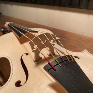 今日は新作の肩掛けチェロ、ヴィオロンチェロ・ダ・スパッラに弦を張りました。