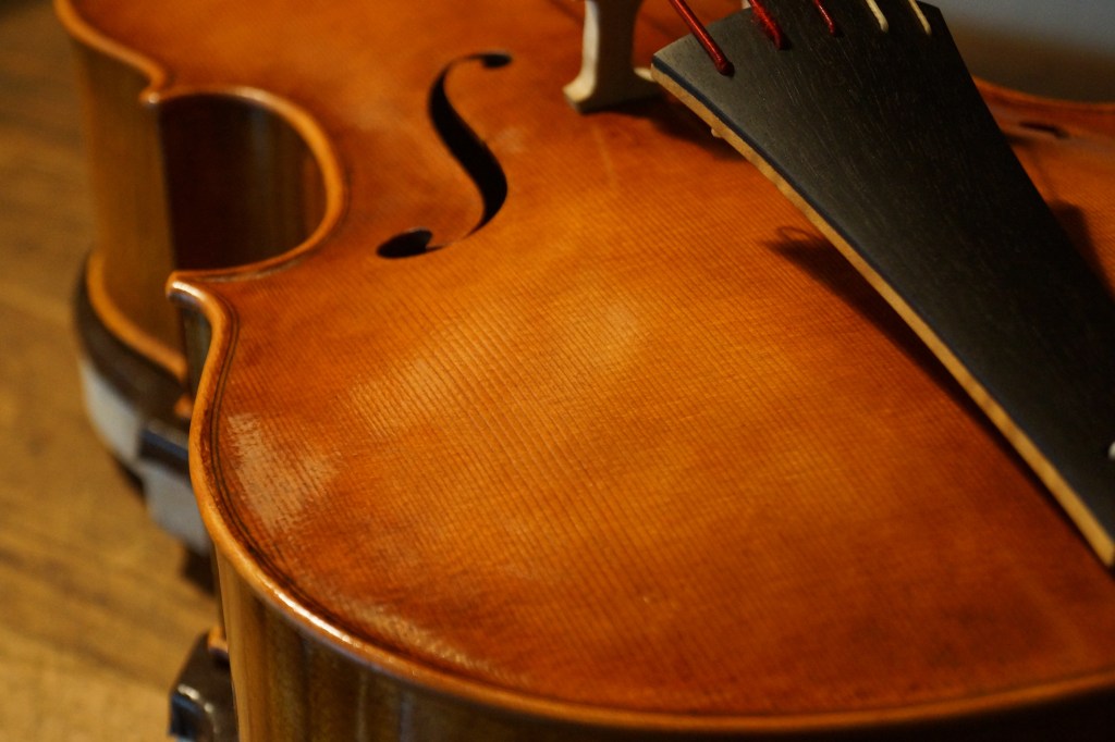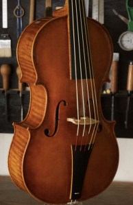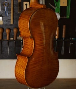 工房の窓からの光だけで撮影したため、やや暗く写ってしまいましたが、5台目となる肩掛けチェロが完成しました!