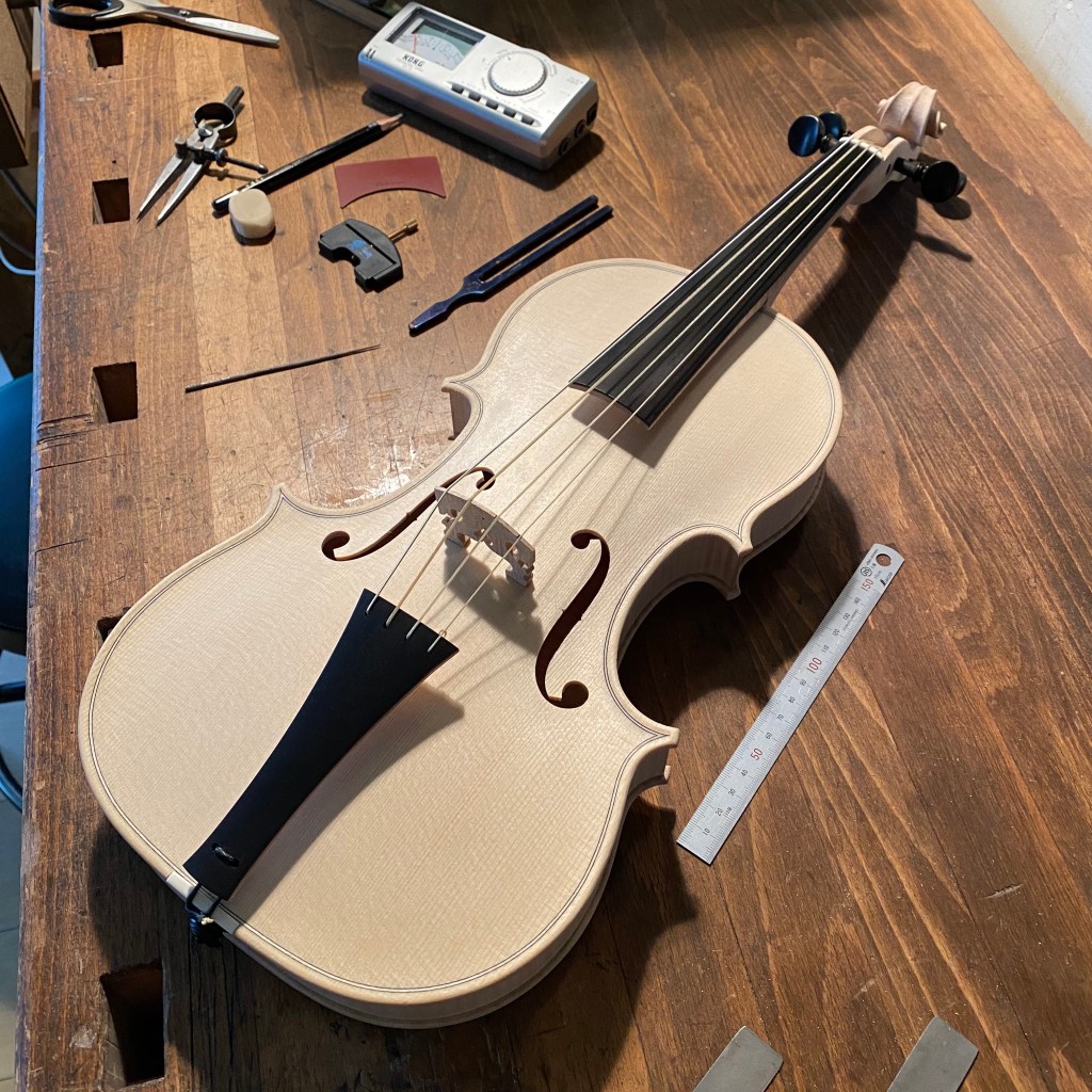 次のお客様からの注文のヴァイオリンが待っているので、すぐに次の楽器に取りかからないといけませんが、少しの間、ニスに塗り前の微調整を行います。
