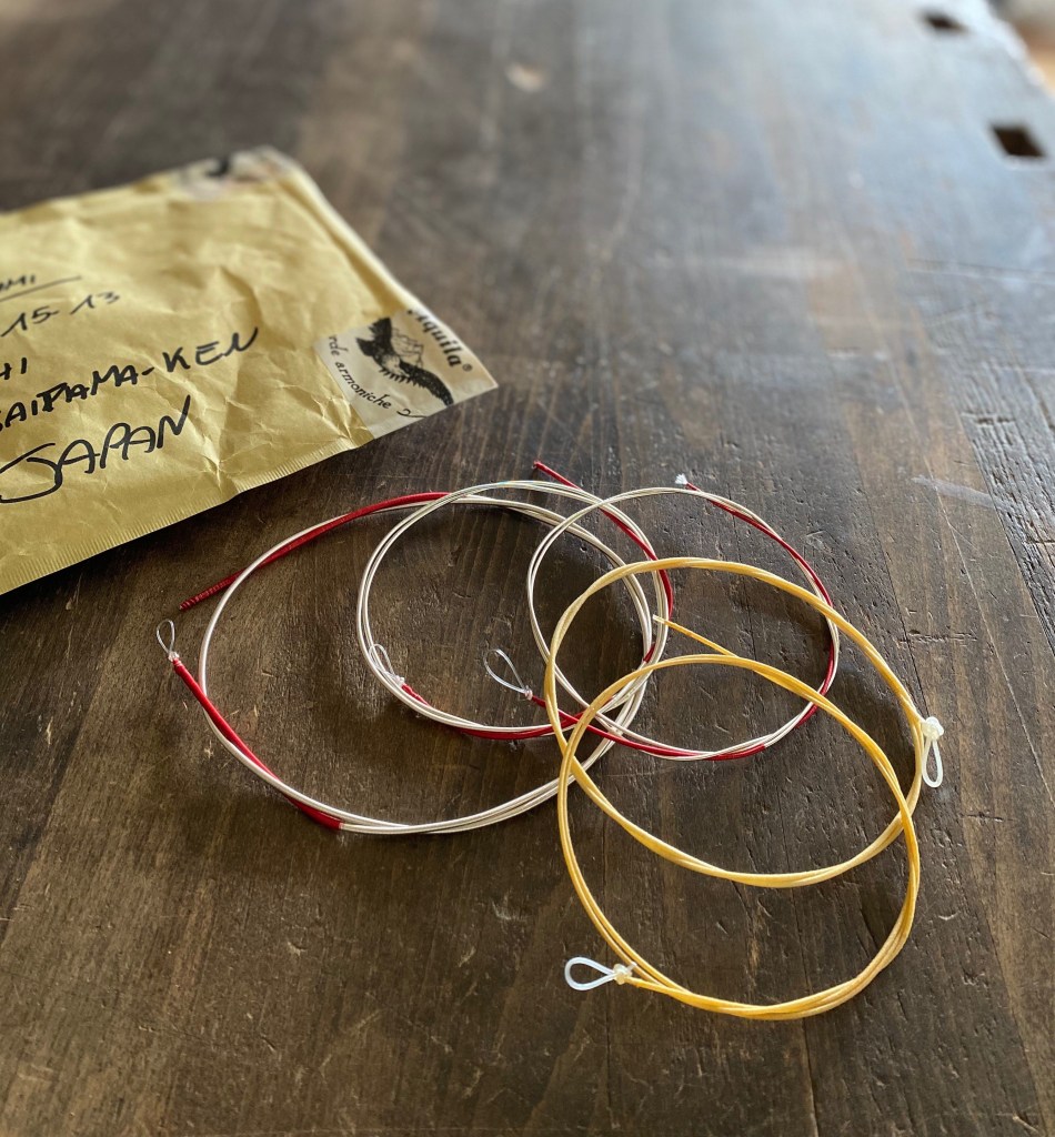 昨日、イタリアのアクイラ社より、肩掛けチェロ用のモダン弦(試作品)を受け取りました!