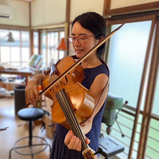 当工房に肩掛けチェロを注文される演奏家のほとんどがヴァイオリニストであるとお話ししたところ、驚かれていましたが、今後もたくさんの方に直接この楽器にふれて、そのおもしろさを感じていただきたいと思います。