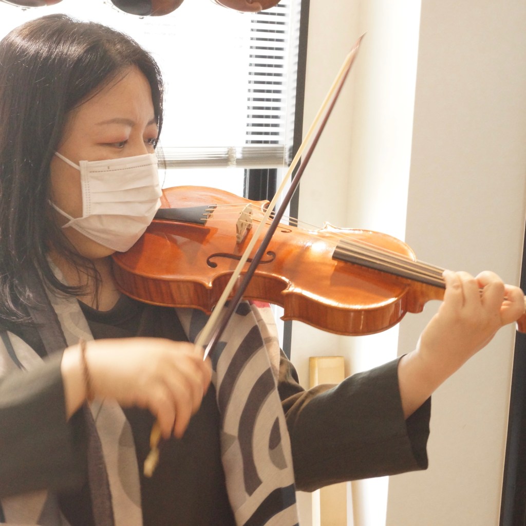 にしむらバイオリンさんにて、バロック・ヴァイオリニストの齋藤佳代さんがバロック・ヴァイオリン3台の試奏、またアトリエカマタさんより預かって持参したバロック弓の試弾をしてくださいました。