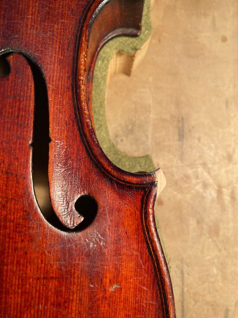 写真はコーナーと呼ばれる突起部分が欠けてしまった楽器の修復です。
