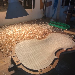 肩掛けチェロの裏板を掘っています(彫っているではなく、文字通り、掘っています)。