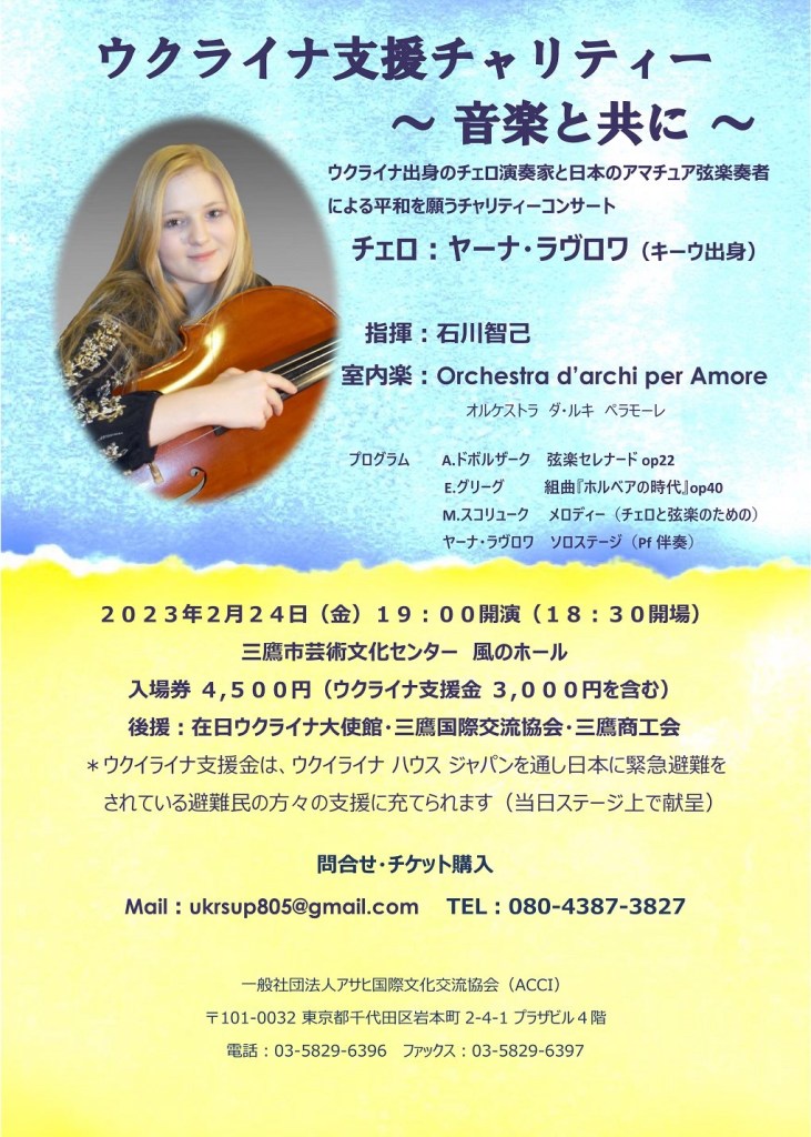 当工房で行っている教室の受講生の方より、ウクライナから避難されて来ている方々のための支援コンサートのお知らせがありましたので、こちらでシェアさせていただきます。