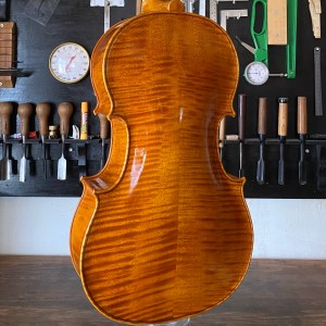 天然の樹脂とオイルは、不純物も多いのですが、それゆえに複雑な煌めきを見せてくれます。一般にディクロイズムと呼ばれたりするオールド楽器にも見られる古来からのニスの特徴ですが、単調な色ではなく、いくつもの色が木の中から輝いているように見えます。こればかりは写真ではお伝えできないので、ご興味ある方はぜひ工房にご覧にいらしてください。