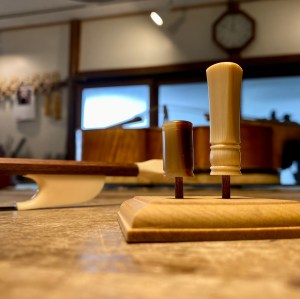 普段は、凄惨な密猟を嫌い、象牙を使うことはないのですが、今回は、お客様のご家族の古い遺品を転用してほしいというご要望をいただき、それならばということでご家族の思い出を身近に置いておける形にして差し上げようと、フロッグやボタン、またここに写真はありませんがモダン弓のチップ作りなどに活かして、納めさせていただきました。